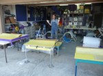 We had actually finished all of the tables and were hoping for the best when we started on the chutes (with their curved surfaces) and realized the stuff was hopeless. Once we converted to the good stuff and saw how well it worked, we decided to redo the tables. Here’s how ineffective the other stuff is: despite having cured on the tables for a couple of hours, the skins still peeled off with the resistance of a post-it note. In contrast, when you set the mats with the good stuff, you had better get it right the first time because it isn’t coming off, ever.